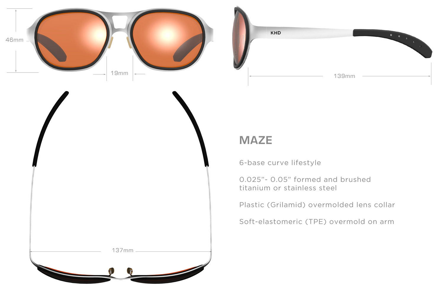 Ultra-lightweight titanium frame is technology realized, pure and simple. These sunglasses have molded TR-90 Grilamid flanges which come in multiple colorways, and secure the polarized impact-resistant lenses in place.  Rubberized-TPE ear rests are available in multiple colorways.